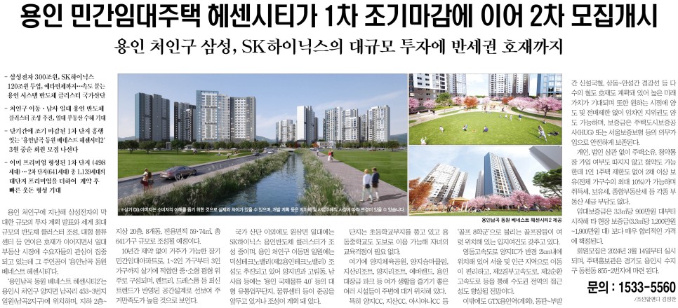 분양 관계자는 “용인남곡 동원 베네스트 헤센시티2는 각종 정부 대출도 받을 수 있어 이자만 내고 살면서도 향후 확정분양가로 내 집 마련이 가능해 전세, 분양의 장점을 모두 갖춘 상품으로 각광받으며 빠르게 계약이 이뤄지고 있다”라며, “가격이 합리적인 것은 물론, 용인 처인구의 대규모 반도체 호재도 예정돼 있어 시세차익도 기대할 수 있어 문의가 꾸준히 이어지고 있다”고 말했다.